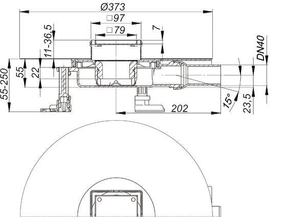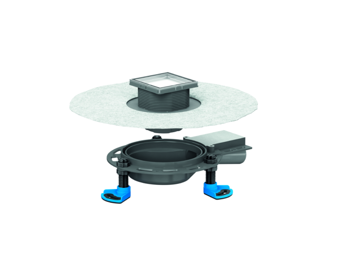 Bodenablauf inklusive Aufsatz mit Edelstahlrahmen zum Befliesen mit individuellen Bodenbelägen. Ablaufgehäuse aus Polypropylen mit Bauhöhe 55 mm, integrierter Sekundärentwässerung, drei schallentkoppelten Montagefüßen zur Fixierung und Höheneinstellung, umlaufenden Verankerungen zur kraftschlüssigen Einbettung in den Estrich, Bauschutzabdeckung und komplett herausnehmbarem, mechanisch wirkendem Geruchs- und Reinigungsverschluss. Mit einklickbarer, 110 mm breiter, flexibler, alkalibeständiger, nicht kapillarer, Riss überbrückender Dichtmanschette mit d: 370 mm zum sicheren Anschluss an Verbundabdichtungen gemäß DIN 18534. Ablaufstutzen aus Polypropylen, DN 40 seitlich, mit Kugelgelenk 0-15 Grad verstellbar zum spannungsfreien Anschluss der Abwasserleitung. Ablaufleistung nach DIN EN 1253: 0,52 l/s. Aufsatz kürzbar für Bodenbeläge 11 - 36 mm (inkl. Kleber), mit Positionierhilfe seitenverstellbar +/- 3,5 mm. Aufsatzverlängerung aus ABS, Fliesenaufnahme und Rahmen aus Edelstahl 1.4301, 100 x 100 mm.