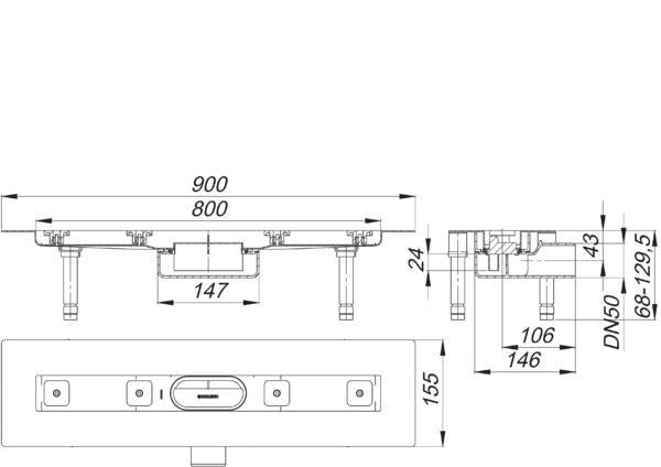 Mit höhenverstellbaren Justierschrauben für Abdeckungen 800 x 40 mm. Rinnenkörper mit Selbstreinigungseffekt durch innenliegendes Gefälle, Einbaumaße 900 mm x 155 mm.