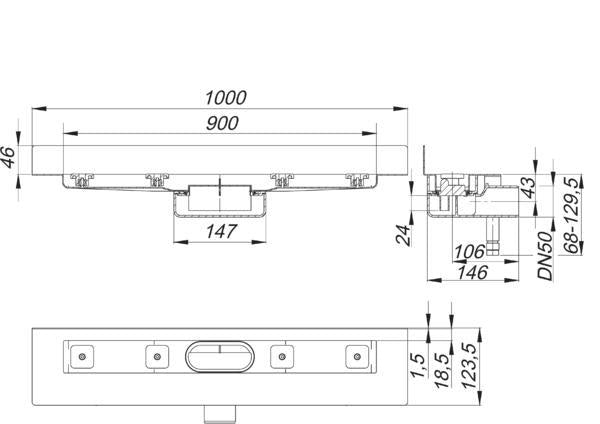 Linienentwässerung aus Edelstahl 1.4301 für die Montage an der Wand. Mit höhenverstellbaren Justierschrauben für Abdeckungen 900 x 40 mm. Rinnenkörper mit Selbstreinigungseffekt durch innenliegendes Gefälle, Einbaumaße 1000 mm x 124 mm. Mit 50 mm breitem, besandetem Flansch zum sicheren Anschluss an Verbund- und Bahnenabdichtungen gemäß DIN 18534, schallentkoppelnden Montagefüßen zur Höheneinstellung, schallentkoppelnden Wandbefestigungen, Schalldämmband, Butyldichtband, Bauschutz,