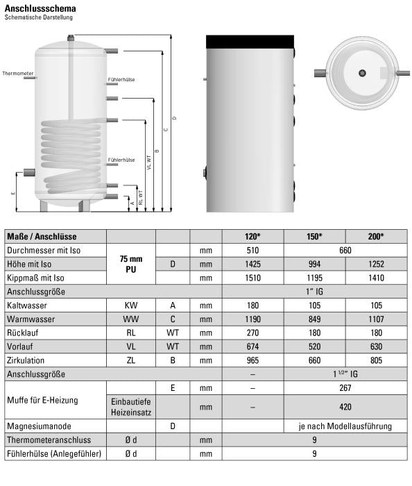 comfort-Stand-Trinkwasserspeicher TS-S 200, stehend, aus Qualitätsstahl S235 JR, emailliert nach DIN 4753, SV 6 bar, Betriebsdruck max. 10 bar, Betriebstemperatur 95 Grad Celsius, 1 Glattrohr-Wärmeübertrager, Magnesiumanode, Revisionsöffnung in 1 1/2 Zoll, höhenverstellbare Stellfüße, Analogthermometer, 1 Muffe für Elektroheizeinsatz mit 1 1/2 Zoll IG, inkl. 75 mm PU-Hartschaum-Isolierung und 5 mm Folienmantel in Weiß, Folienmantel abnehmbar, Speicher mit Energieeffizienzklasse A, Durchmesser inkl. Isolierung: ca. 660 mm, Höhe inkl. Isolierung: ca. 1252 mm, Zapfleistung: 710 l/h, Leistungskennzahl NL: 4, Bereitschafts-Wärmeaufwand nach DIN EN 12897: 44 W/h, Modell: comfort, comfort-Nr.: 61 05 408