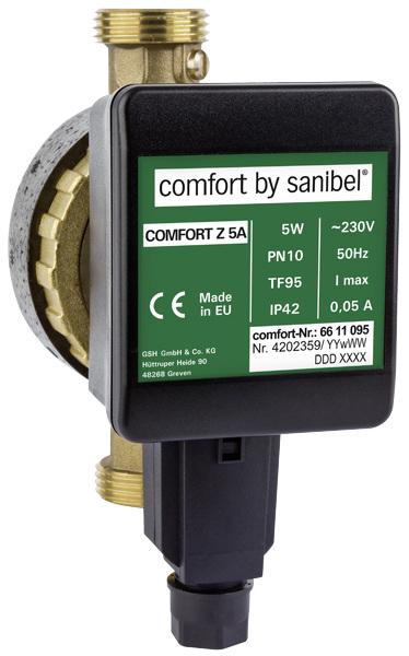 comfort-Trinkwarmwasser-Zirkulationspumpe Z 5A für Rohreinbau mit Verschraubungsanschluss und blockierstromfestem Synchronmotor, serienmäßige Wärmedämmschale, Gehäuse-Gewinde Rp ½. Ausführung A mit Kugelabsperr- und Rückschlagventil mit Gewinde G1. Diese Umwälzpumpe ist nur für Trinkwasser geeignet. Modell: comfort comfort-Nr.: 66 11 095